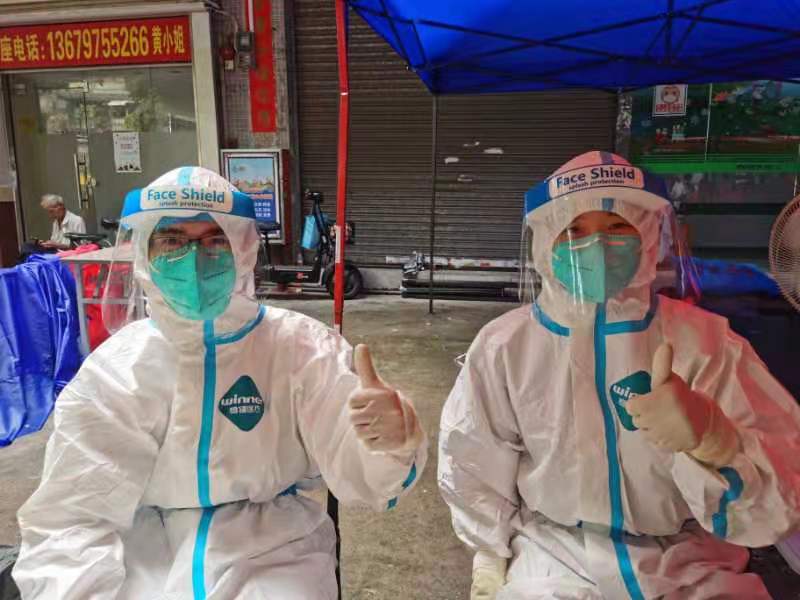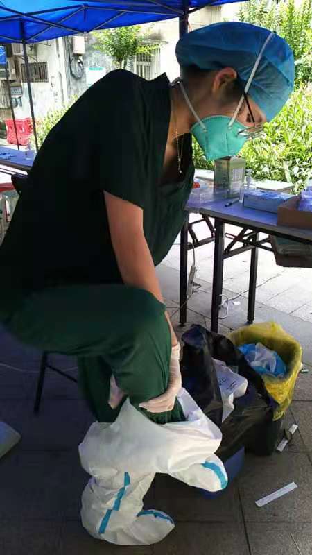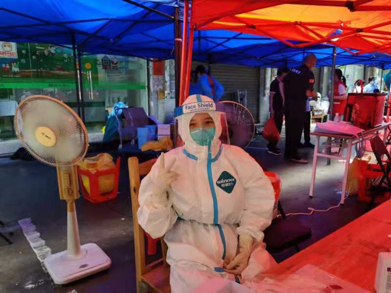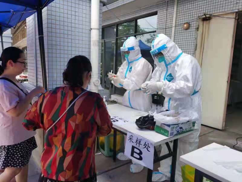 防护服、口罩、面屏、手套……采样点的医务人员“全副武装”,在烈日下为群众进行采样工作。