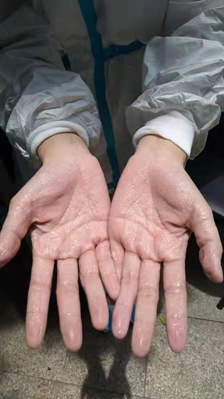 今日禅城区气温高达36℃,中午12点左右,现场检测人员结束一上午的核酸检测工作,他们将防护服脱下时,身上的便服早已与防护服“湿为一体”,脸上也勒出一道道印,手上的皮肤也早已起皱。
