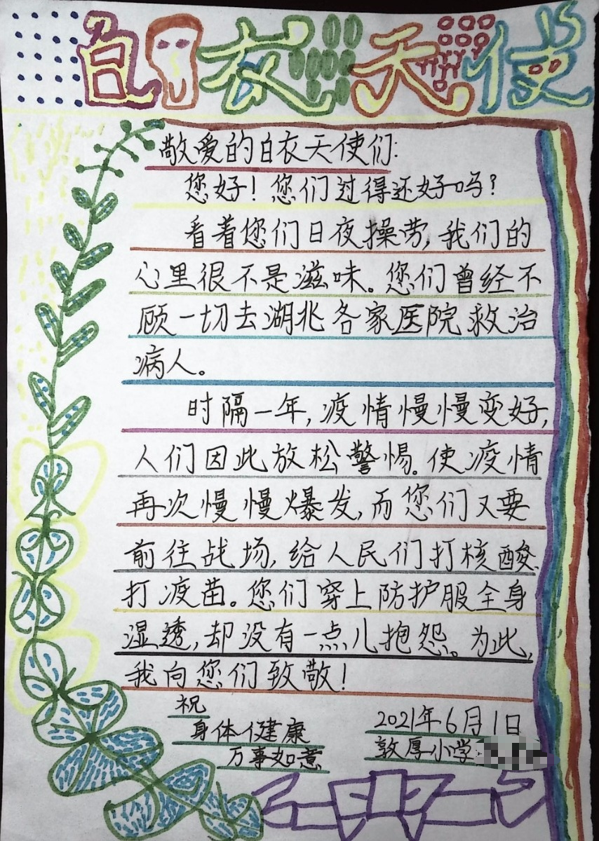 来自敦厚小学四年级二班的同学给我们的医护人员送来了感谢信,为所有奋战在抗疫一线的白衣天使们加油打气!