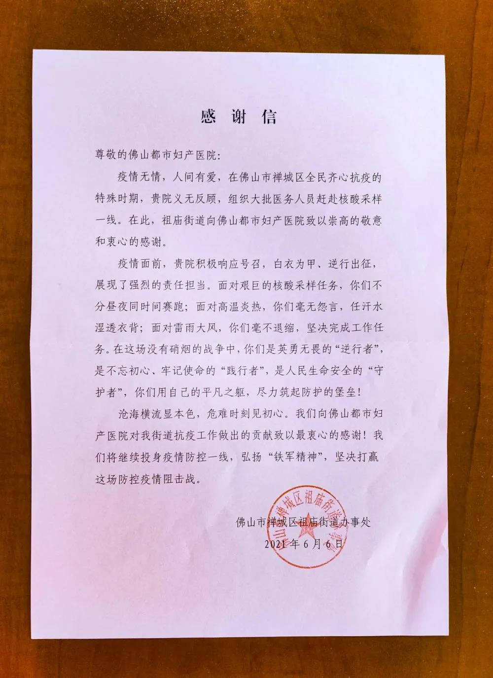 感谢祖庙街道对佛山都市妇产医院抗疫工作的肯定和认可!