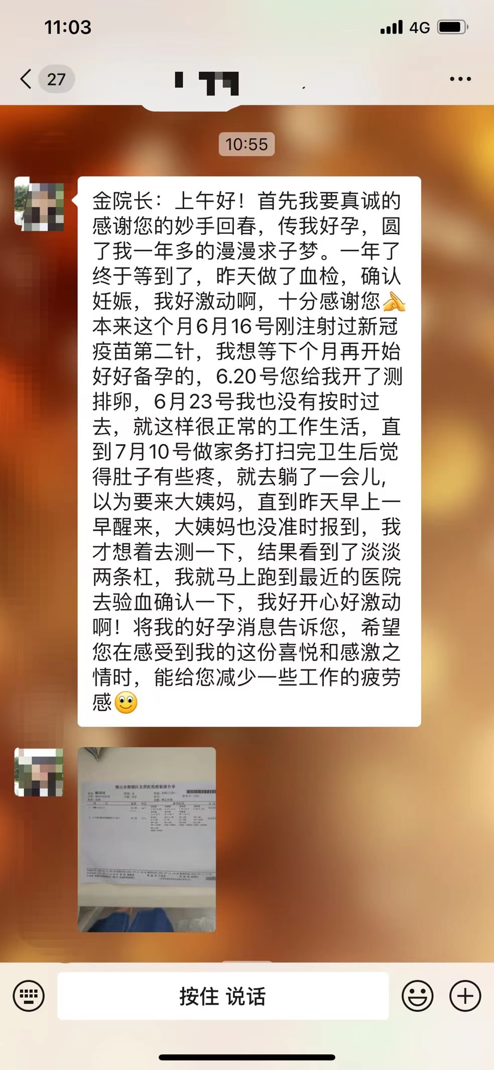 “我到处寻医,就想要个孩子,这么多年了,金院是最负责任的,她给我们留微信接受咨询,金院的医嘱非常奏效,找她看诊就是很安心、很踏实的!”这些回来送锦旗的妈妈们,谈起前几年的漫漫求孕路满满感慨,但话锋一转,说到金院,大家言语间都是藏不住的钦佩。