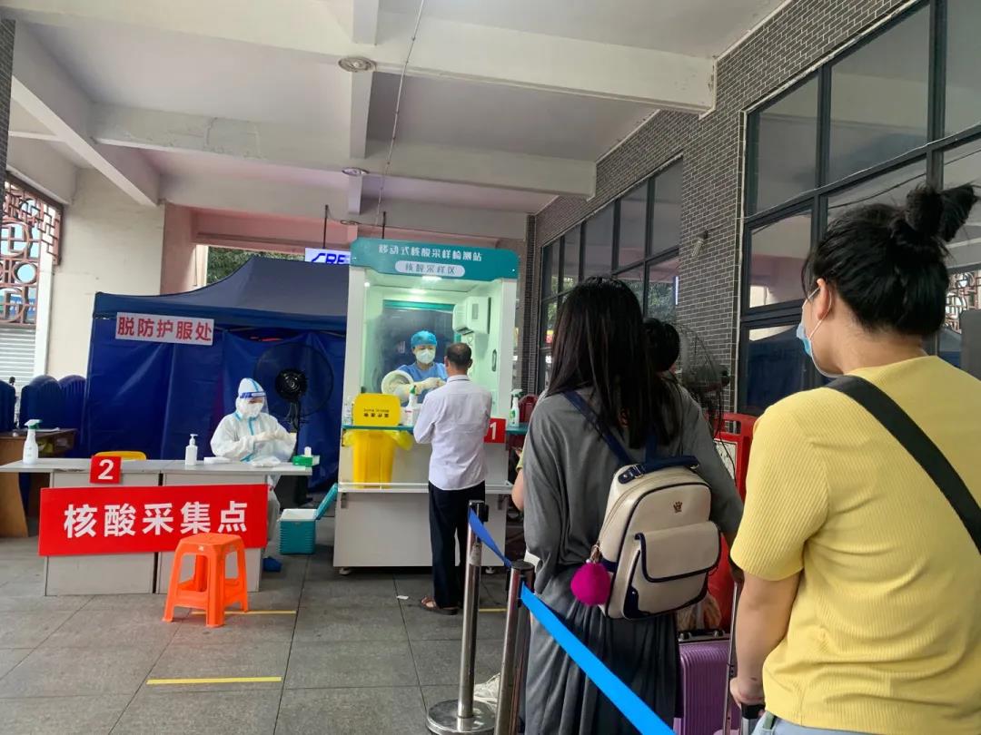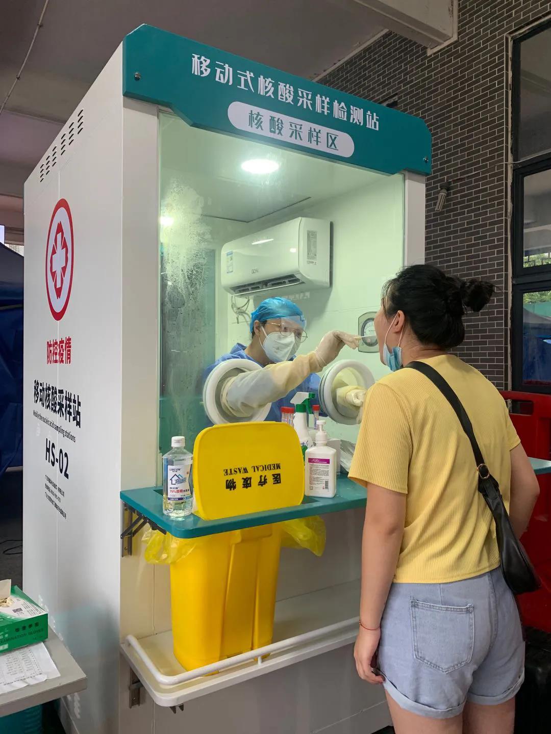 工作时间跨度大、棚内温度高、旅客多,加上佛山的多雨天气,核酸检测任务非常繁重。为推进采样工作更加安全、快速、有序进行,区卫健局调配来一台移动式核酸采样亭,设备交接后交通部门及时接电,采集医护的工作环境得到了很大的改善。