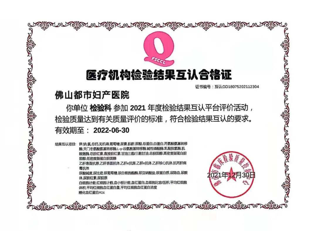 在2021年度检验结果互认平台评价活动中,佛山都市妇产医院48个检验项目顺利通过佛山市检验结果互认资格,本次通过互认项目所颁发的证书的有效期至2022年06月30日。