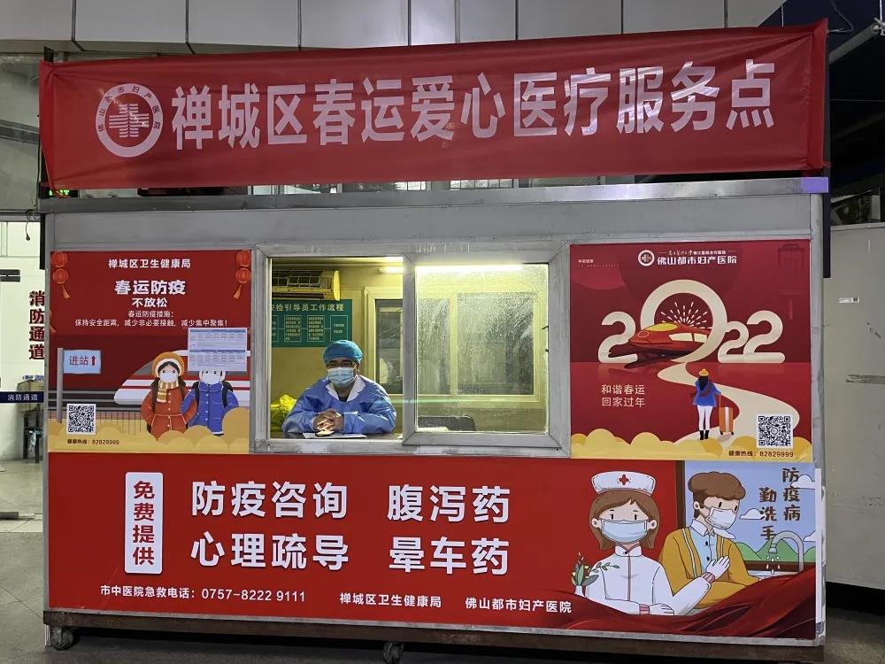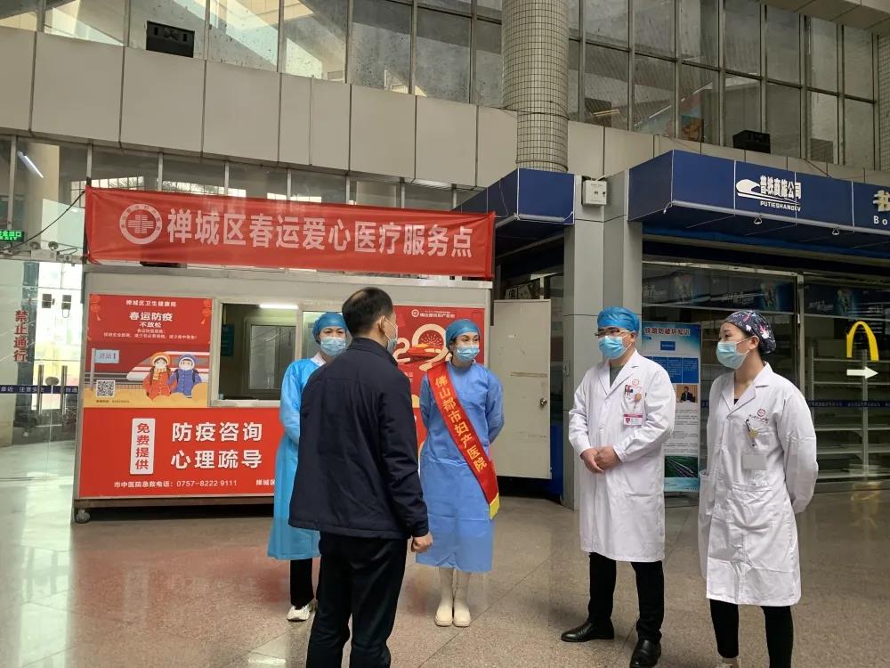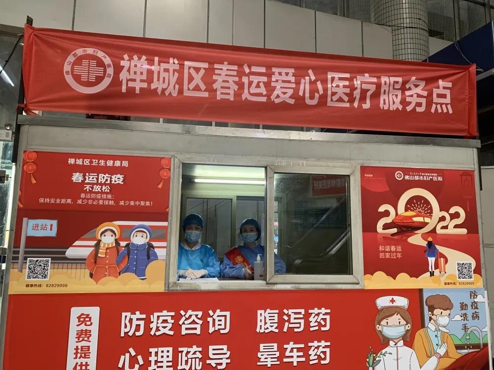我院春运爱心医疗队派驻在佛山火车站一楼站内候车厅,以医疗服务、防疫保障、应急救援为主,为过路旅客免费提供健康咨询,发放防疫物资、应急药品,为旅客提供暖心服务。