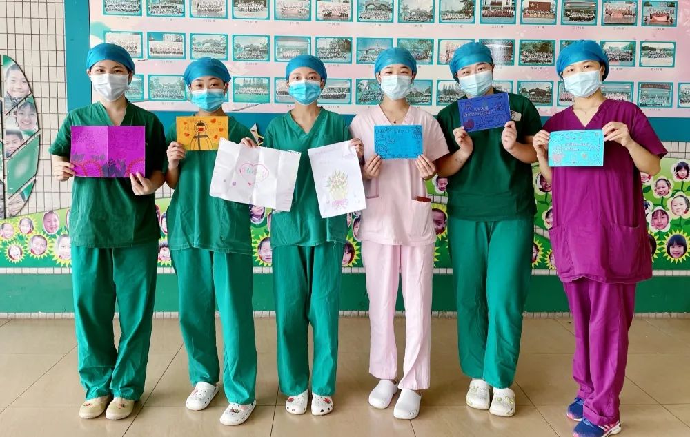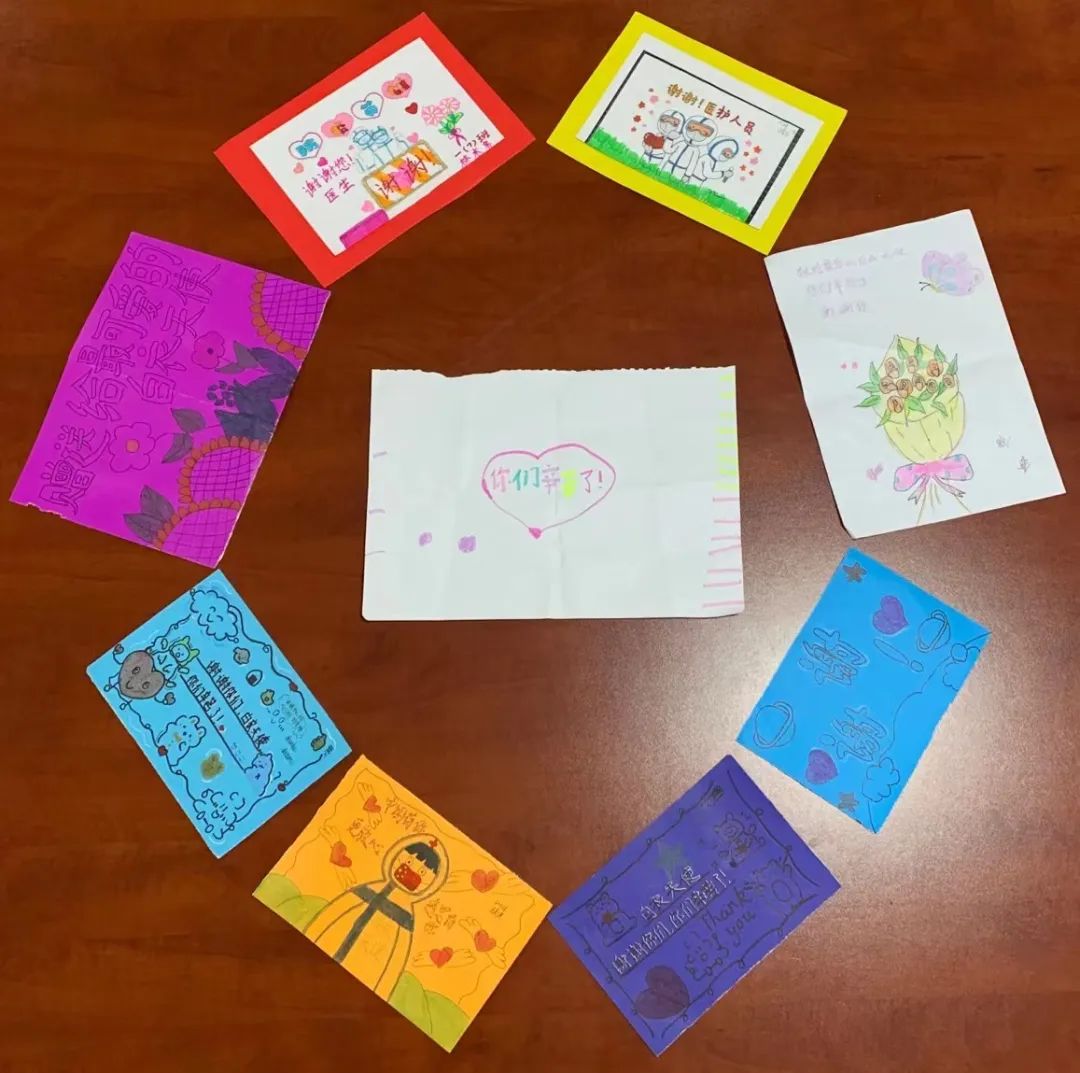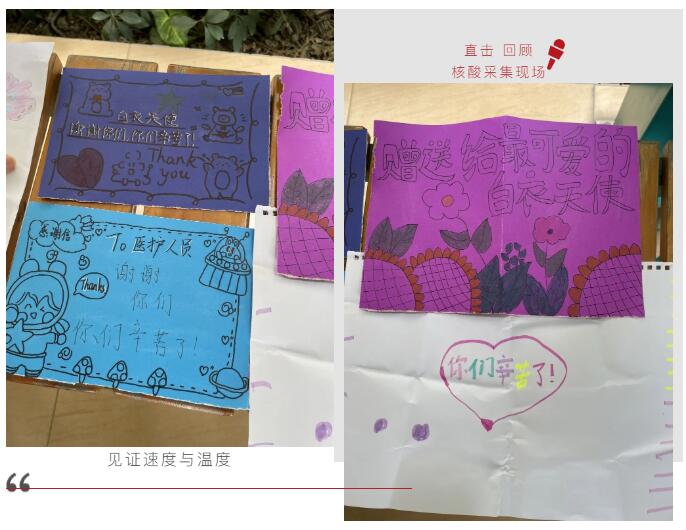 “大白”们沿着眉间滴落的汗水,湿透的衣衫,抬起、放下无数次地重复着动作的双手……师生们看在眼里,记在心上,除了积极配合采样工作以外,学生们纷纷用一张张纯手工制作的卡片来表白我院医护人员。