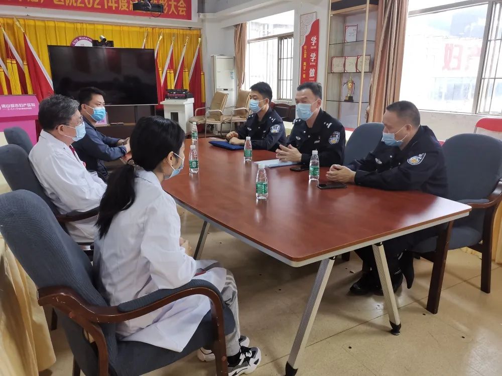 曹队长在听取舒院长汇报后,对我院与永安派出所和谐共建,合力打造平安医院的做法给予充分肯定,对永安派出所做的工作予以高度评价。他强调,疫情防控期间双方更要增强沟通交流,才能更好地保障医务人员安全,维护良好的诊疗秩序,确保社会治安稳定。他们表示,下一步将加强与医院的联防联控,推动安全防范,进一步做好医院内部治安环境整治、医患矛盾纠纷化解等方面工作。与会人员就加强双方交流沟通,推动警医联动机制,提高安全防范意识等提出了切实可行的改进建议。
