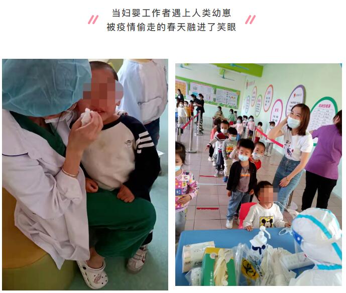 个别年幼的小朋友哭着不敢做核酸时,我们的医护人员和老师就耐心哄着他们进行核酸采样,做完之后还夸赞小朋友“真棒”!