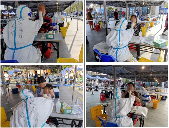 17日,“排雷”工作在继续,都市医护院内、院外两处跑,更要打起十二分精神。为了减少群众排队等待时间,抓紧完成检测工作,化身“大白”的他们同样严阵以待,熟练、高质量地完成每一次采样。