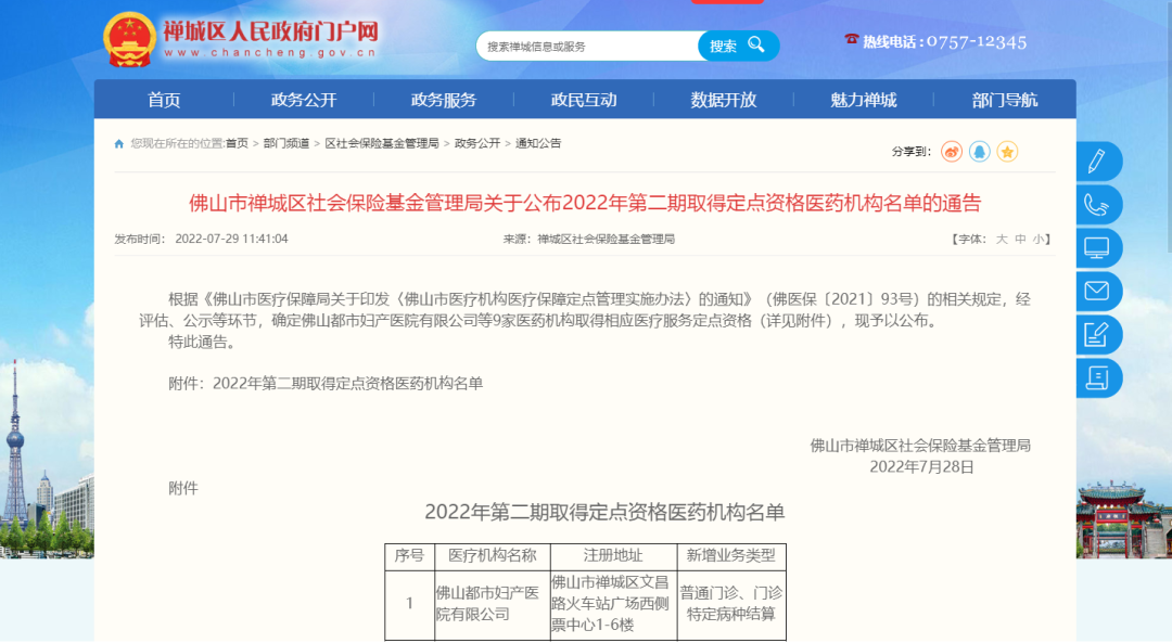 好消息!禅城区2022年第二期取得定点资格医药机构名单公布!佛山都市妇产医院新增普通门诊、门诊特定病种结算业务,2022年8月1日起,职工医保在我院妇科、产科、儿科、内科、中医科门诊看病都可以报销了!请居民、患者朋友相互转告。