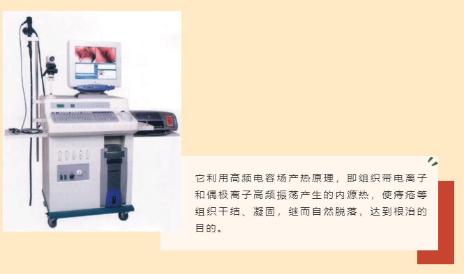 它利用高频电容场产热原理,即组织带电离子和偶极离子高频振荡产生的内源热,使痔疮等组织干结、凝固,继而自然脱落,达到根治的目的。