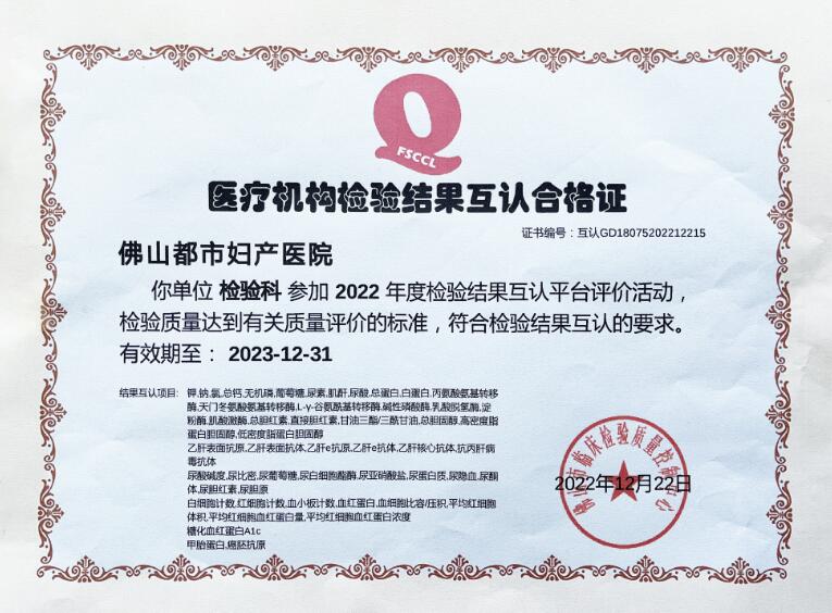 在2022年度检验结果互认平台评价活动中,佛山都市妇产医院再原有49个检验互认项目的基础上,新增两项(甲胎蛋白、癌胚抗原),至此,我院佛山市检验互认项目新增至51项,且本次通过互认项目所颁发的证书的有效期至2023年12月31日。