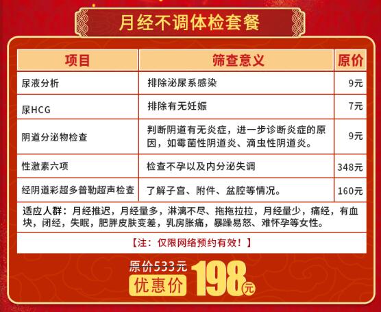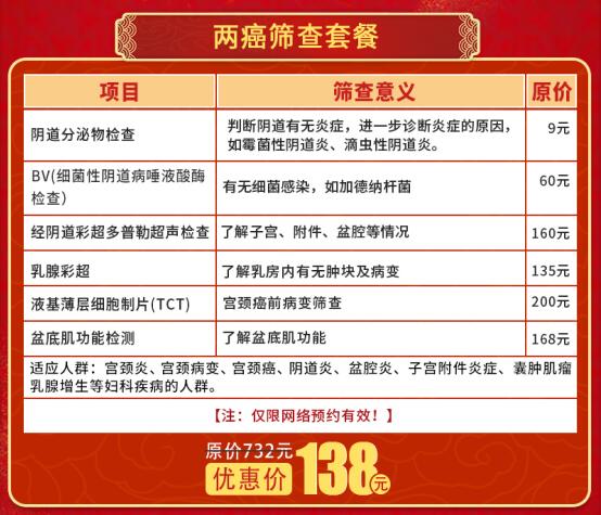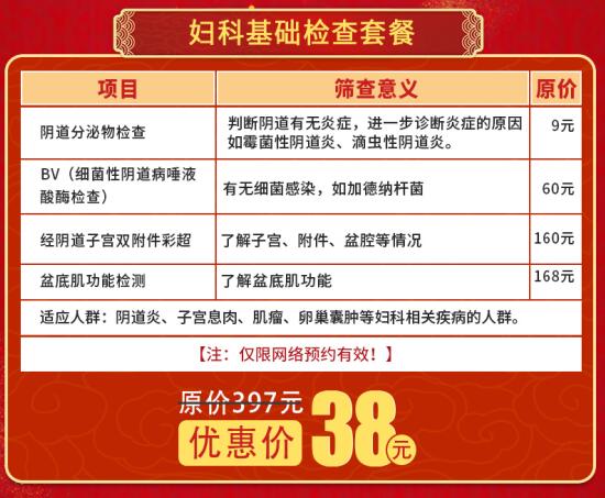 温馨提示:佛山都市妇产医院针对女性健康,制定了多种妇科检查套餐,包括38元、138元、198元、468元四种套餐,您可以根据自身症状,和具体情况,进行个性选择哪一种检查套餐。以上套餐,活动时间有限,先到先得!